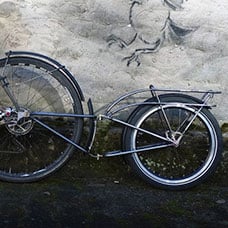 Diese trotz sicherer und fester Verbindung horizontal bewegliche Achsaufnahme und der senkrechten Drehachse in der hinteren Rahmenkonstruktion des Fritz-Cargo ermöglicht in Verbindung mit dem kleinen 20“ Laufrad einen sehr kleinen Kurvenradius und ein besonders wendiges Fahrverhalten.